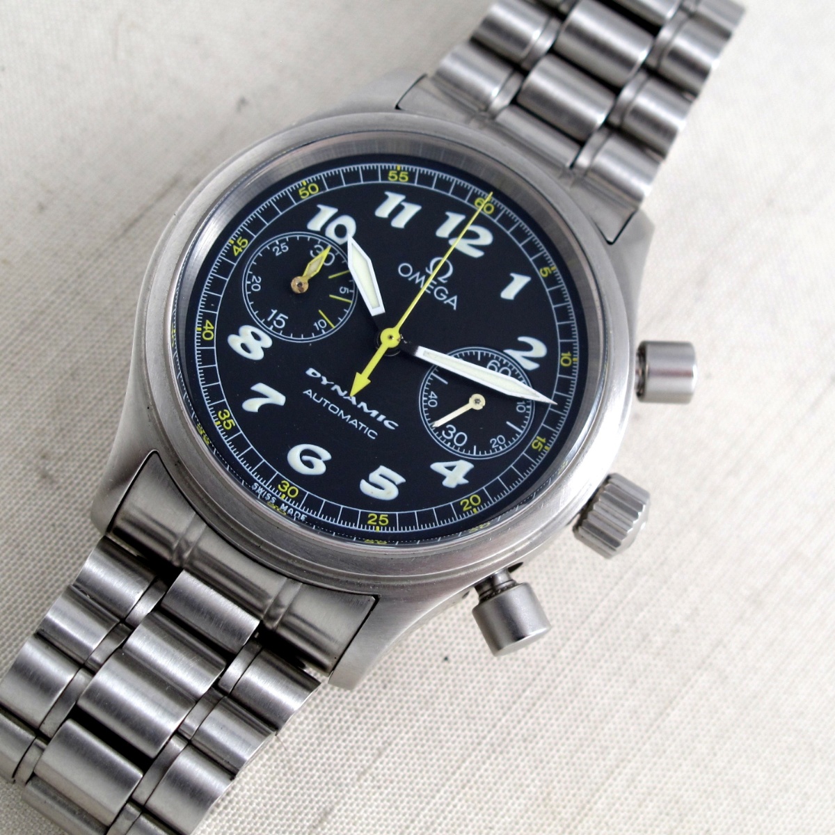 Beautiful Omega Dynamic III chrono full set, circa 1997. The card does not show the year but the watch was produced for a short period. 38mm steel case. steel bracelet. Automatic chronograph caliber 1138 movement. Well-preserved watch. B&P